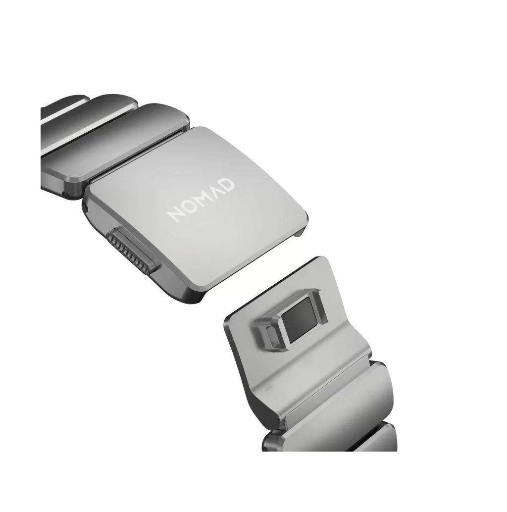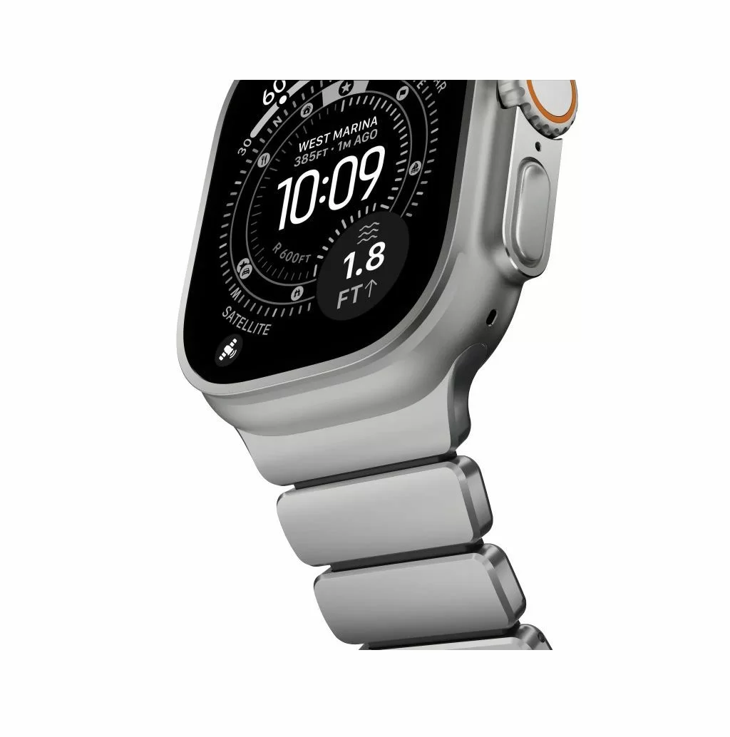 Ремешок Nomad Stratos объединяет несочетаемое: внешний каркас звеньев отлит из титана Grade 4, а внутренняя часть выполнена из мягкого фторэластомера (FKM). Титан Grade 4 значительно прочнее стандартных сплавов, используемых в аксессуарах, а специальное DLC-покрытие защищает поверхность металла от царапин и потертостей, сохраняя премиальный вид даже при жесткой эксплуатации.