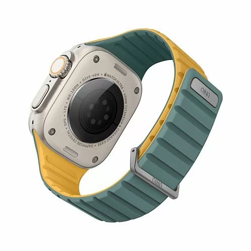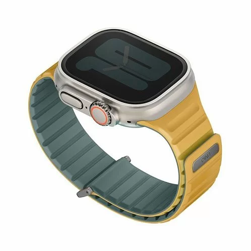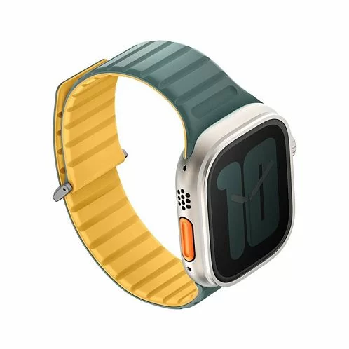 Двусторонний ремешок из мягкого силикона Uniq REVIX EVO для Apple Watch с размером корпуса 49-46-45-44. Вы можете легко поменять внешние стороны ремешка в зависимости от своего стиля и предпочтений. Фиксируется на руке с помощью удобной магнитной застежки, выдерживает нагрузку до 1.2 кг. Возможность регулировки длины за счет встроенных магнитов обеспечивает точное соответствие размерам руки. Металлическая стальная застежка дополнительно фиксирует устройство на запястье, позволяя не беспокоиться об утере даже при занятиях спортом.
