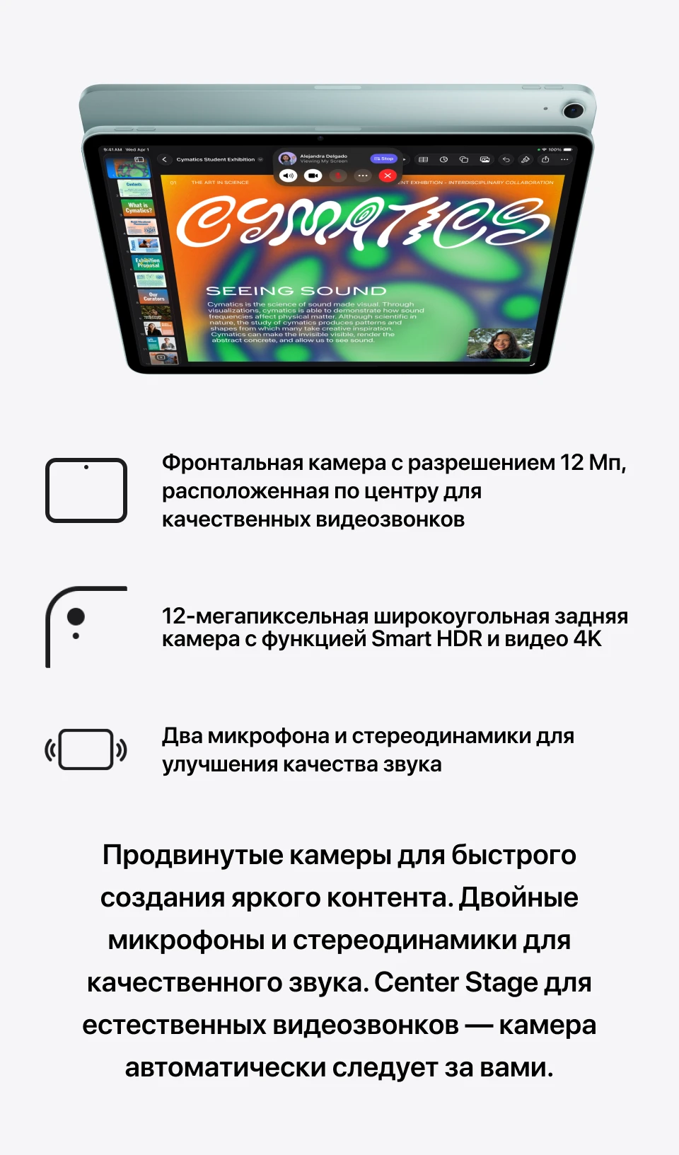 Основная камера — 12 МП, f/1.8 — записывает видео в 4K 60 fps с поддержкой Dolby Vision, Audio Mix и шумоподавлением ветра. Фронтальная 12 МП с Center Stage автоматически удерживает вас в центре кадра при видеозвонках, даже если вы встаёте и ходите. Стереодинамики обеспечивают широкую звуковую сцену — детали голосов и звуков при FaceTime-звонках различимы чётко.