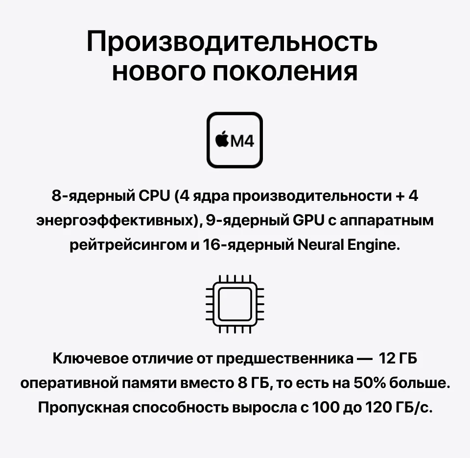 Но главное изменение, которое повлияет на работу каждый день, — это 12 ГБ оперативной памяти вместо 8 ГБ у предшественника. Прирост на 50%. Пропускная способность памяти выросла с 100 до 120 ГБ/с. В практических терминах это значит: монтаж 4K-видео в Final Cut Pro без подтормаживаний при переключении между временными шкалами, работа с многослойными проектами в Procreate без потери отзывчивости, обработка больших RAW-файлов в Pixelmator Pro без ожидания.