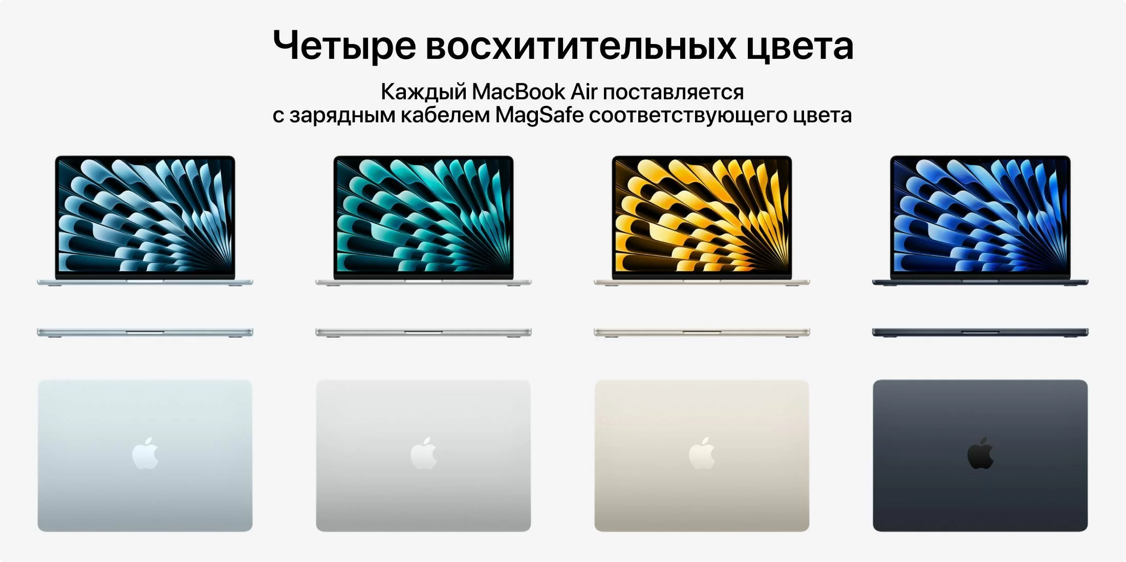 Четыре цвета на выбор — Sky Blue, Silver, Starlight и Midnight. Каждый MacBook Air поставляется с кабелем MagSafe в тон корпусу.