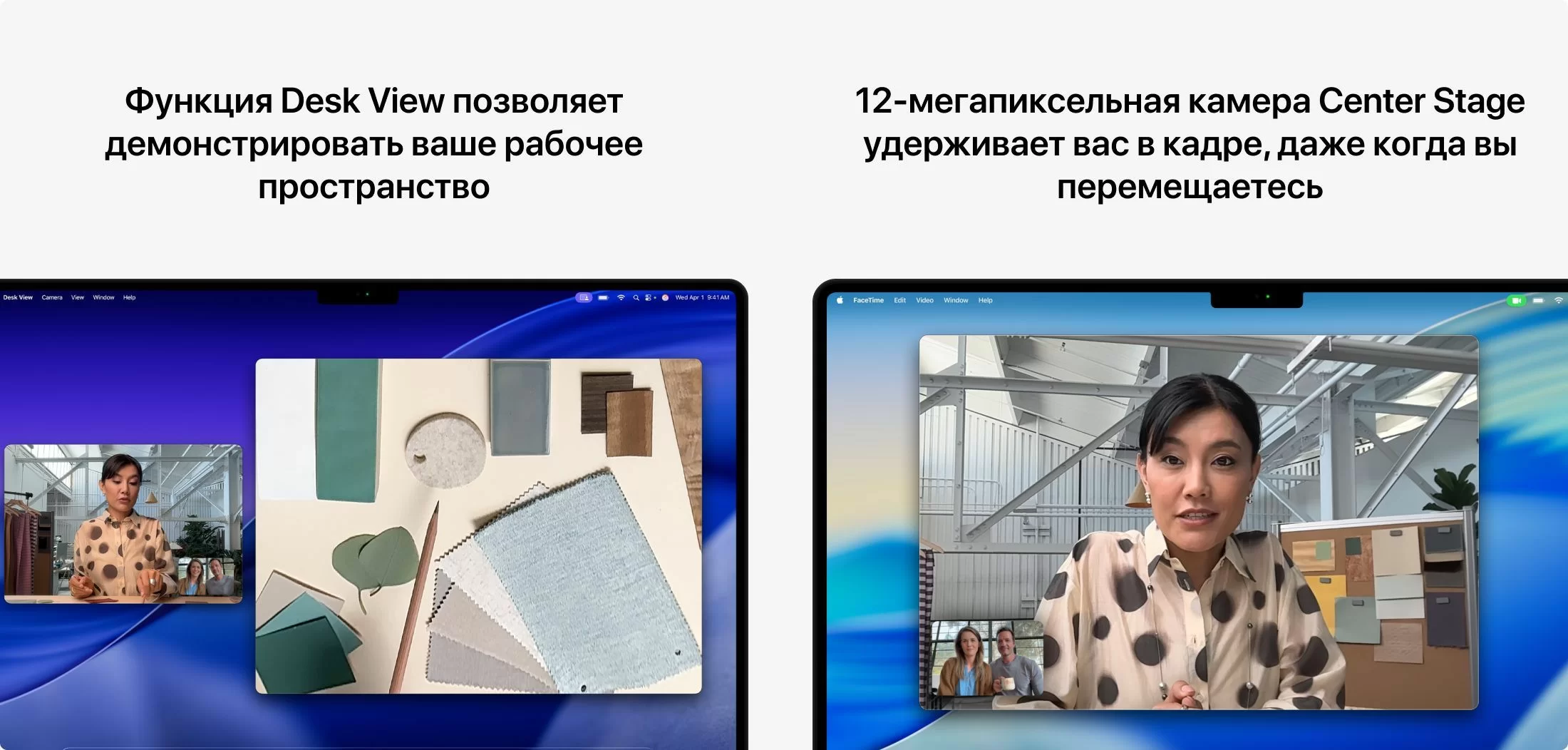 12‑Мп камера Center Stage сохраняет вас в кадре и показывает в лучшем свете при любом освещении. В паре с продвинутыми микрофонами и динамиками она даёт полный контроль над встречей — даже на расстоянии.