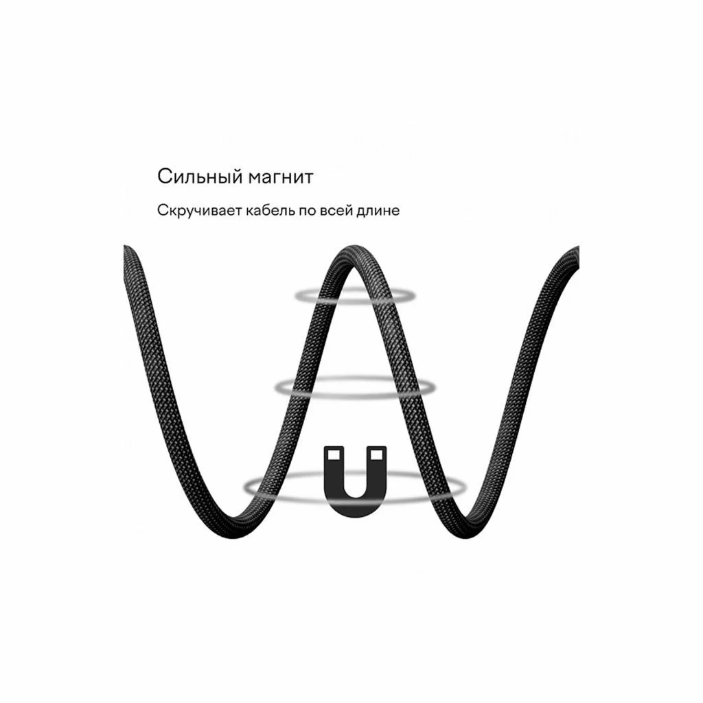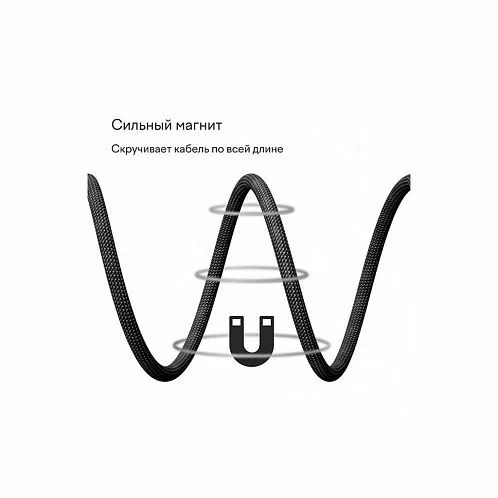 Ключевой особенностью кабеля является его магнитная конструкция, которая позволяет удобно скручивать и фиксировать кабель в компактном положении, предотвращая спутывание.