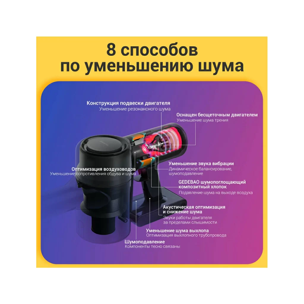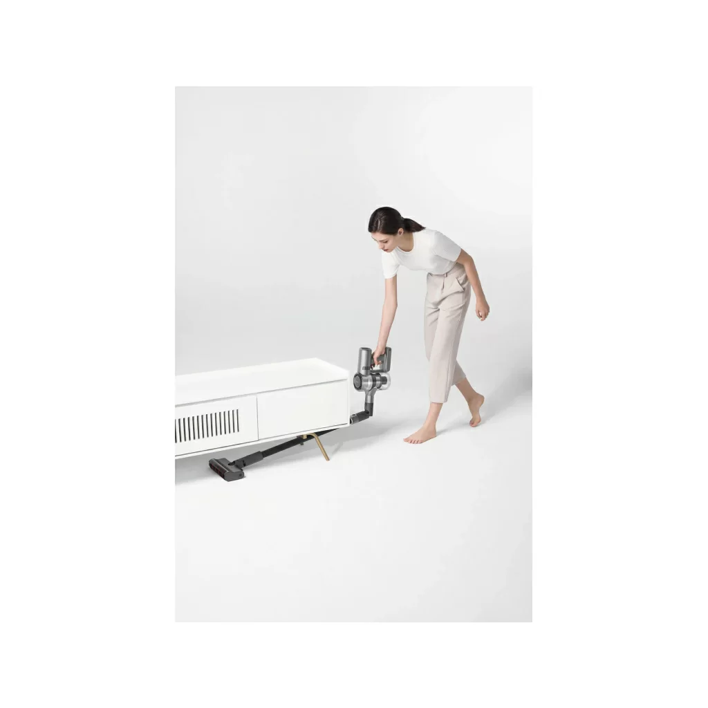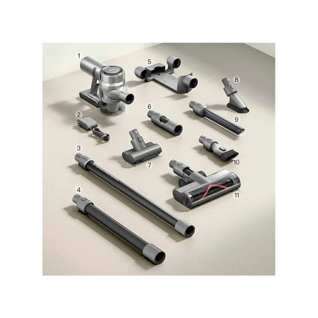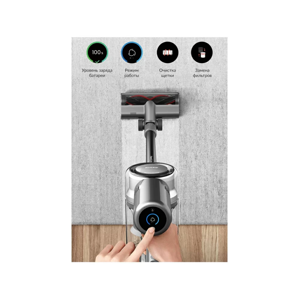 Dreame V12 оснащен электродвигателем со скоростью 150000 об/мин. Он поддерживает 3 режима работы, мощность всасывания достигает отметки 185 аВт. На одном заряда гаджет может отработать примерно 1,5 часа. Вместе с дополнительными насадками можно осуществить полноценную сухую уборку всего дома!