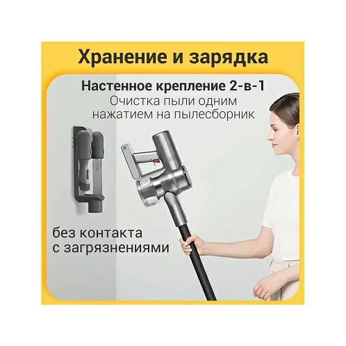 Dreame V12 оснащен настенным держателем 2-в-1, который предназначен для хранения и зарядки устройства. Очистка пылесборника осуществляется бесконтактно, нажатием одной кнопки. Конструкция пылесоса легко разбирается, а его фильтры и щетки можно помыть самостоятельно обычной водой.