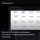 Просите Алису искать и включать музыку, фильмы или сериалы, а потом управляйте контентом на экране касаниями: перематывайте, ставьте на паузу и выбирайте нужное. Смотрите телеканалы. Задавайте Алисе вопросы — и не только слушайте её ответы, но и смотрите их на экране. Или пользуйтесь браузером.